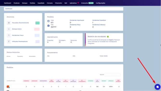 Para começar, acesse o Dashboard da Magis5 HUB e clique no ícone de balão de chat, localizado no canto inferior direito da tela.