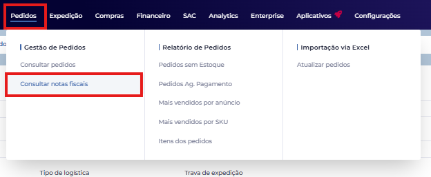 Para acessar o relatório vá para "Pedidos" e depois clique em "Consultar notas fiscais".