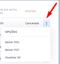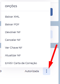 No menu de Opções (⋮) ao lado do status da nota, você encontrará as ações disponíveis. Note que as funções exibidas variam conforme o status atual da Nota Fiscal.