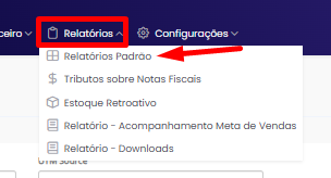 Para gerar um Relatório de Produto em Estoque, na barra de menus, vá em "Relatórios", "Relatórios Padrão".