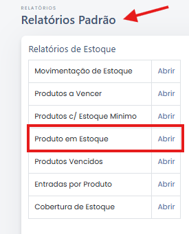 Na página de "Relatórios padrão" na coluna de “Relatórios de Estoque”, clique em “Produto em Estoque”