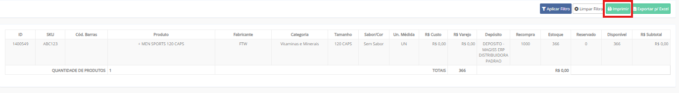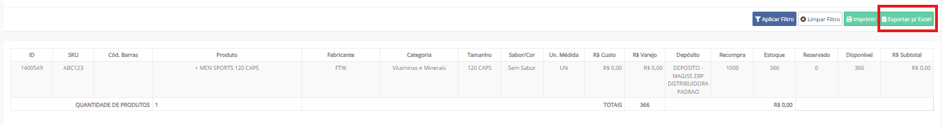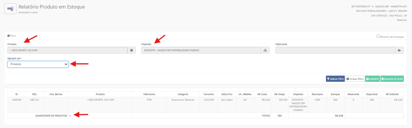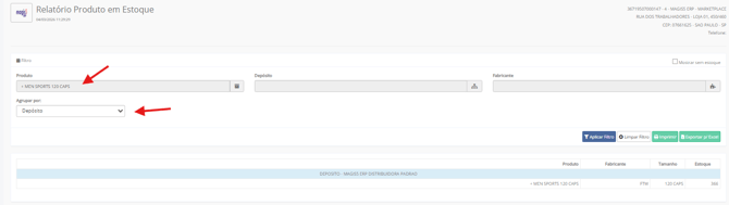 No exemplo abaixo, foram selecionados os filtros “Produto” (+ MEN SPORTS 120 CAPS) e “Depósito”, com agrupamento por “Produto”. Com essa configuração, a plataforma apresentou a quantidade disponível do produto selecionado no depósito informado.