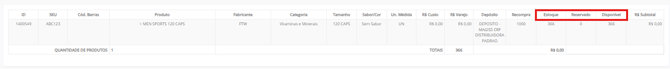 - Reservado: quantidade de produtos reservados em estoque em outros pedidos que estão aguardando andamento.