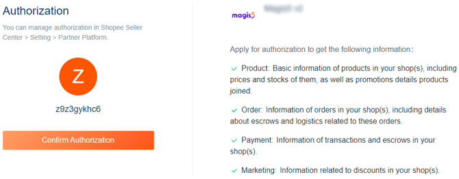 Você será encaminhado para a tela da Shopee, faça o login em sua conta e clique em "Confirm Authorization" para autorizar a conexão.