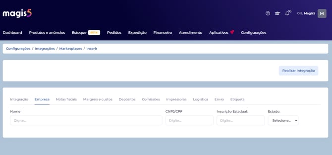 CNPJ - deverá ser informado o CNPJ cadastrado na conta do marketplace que será integrado.