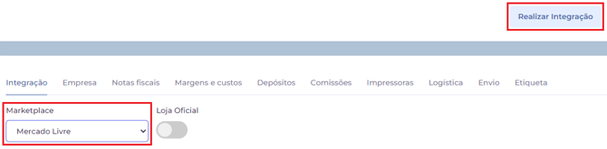 Selecione "Mercado Livre" no campo marketplace e clique em "Realizar Integração". Ative a opção "Loja Oficial" se este for seu caso.