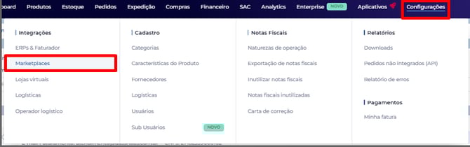 Feito o login no Magis5, vá para "Configurações", depois até "Integrações" e por último clique em "Marketplaces".
