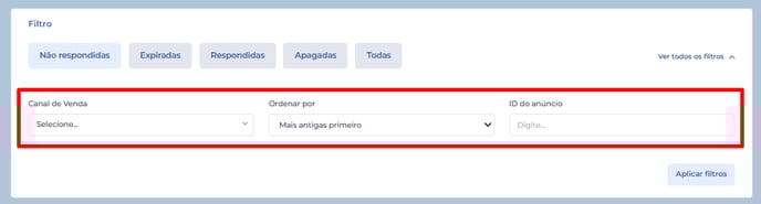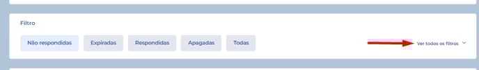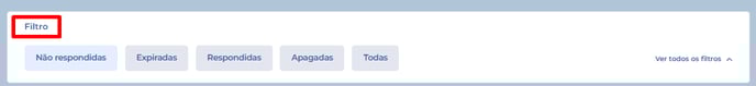 A tela exibirá inicialmente os seguintes filtros: "Não respondidas", "Expiradas", "Respondidas", "Apagadas" e "Todas". Caso queira fazer uma busca mais específica clique na opção "Ver todos os filtros"