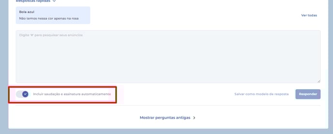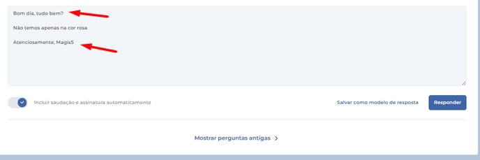 A opção "Incluir saudação e assinatura automaticamente" logo abaixo da caixa de texto, quando ativada, permite que você escreva apenas o conteúdo da resposta.