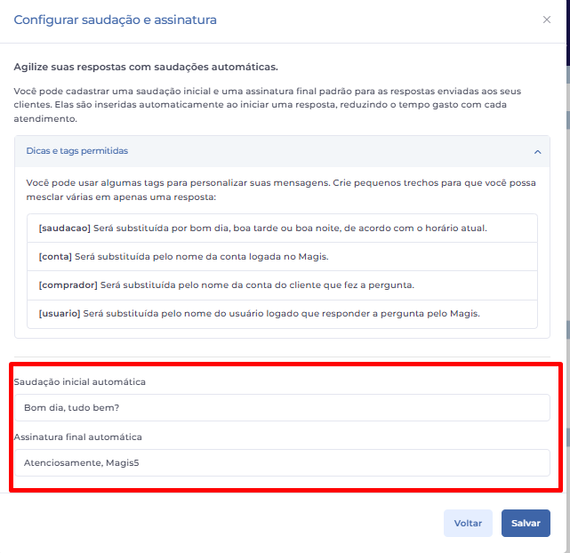 O sistema adicionará automaticamente a saudação (como “bom dia”, “boa tarde”, etc.) e a assinatura ao final da mensagem. Ou seja, você não precisa mais inserir essas partes manualmente sempre que for responder uma pergunta.