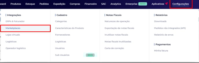 Feito o login no Magis5, vá para "Configurações", e por último clique em "Marketplaces"
