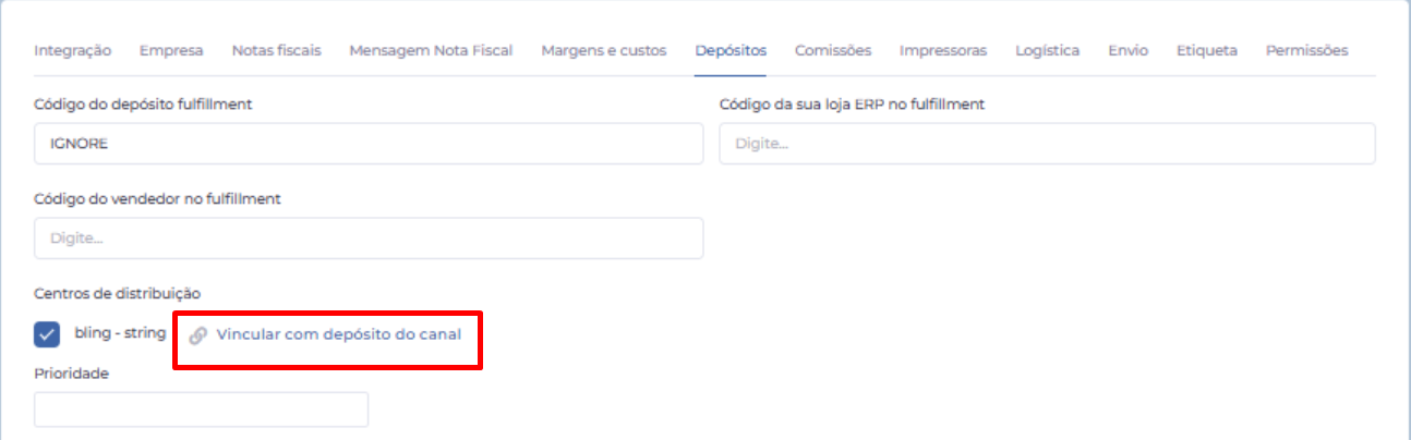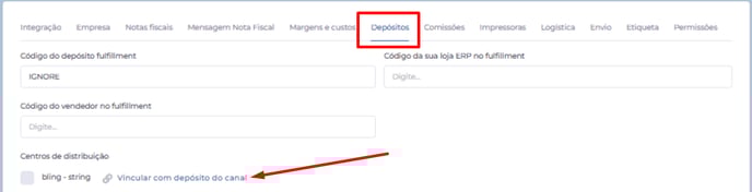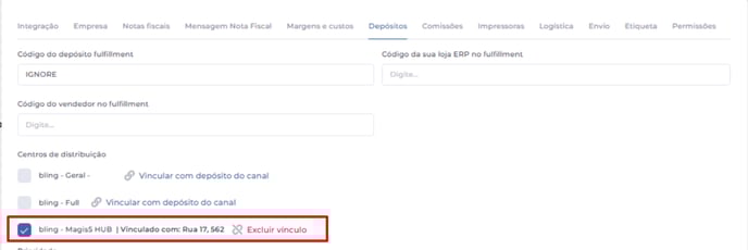 Feito isso, clique em "Vincular com depósito do canal de venda" para associar o depósito do Mercado Livre.