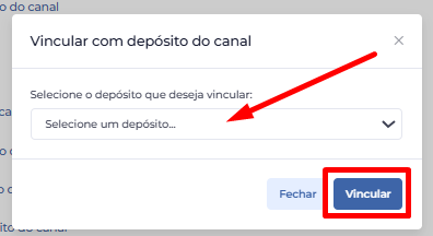Será exibida a lista de depósitos existentes no Mercado Livre. Após selecionar o depósito desejado, clique em "Vincular".