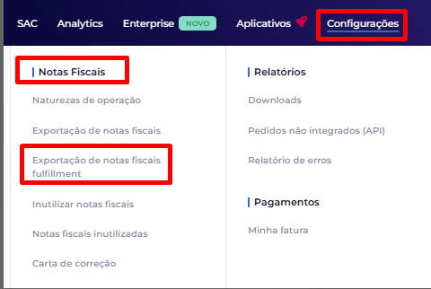 Feito o login no Magis5 HUB, vá para "Configurações", depois até "Notas Fiscais" e por último clique em "Exportação de notas fiscais fulfillment".