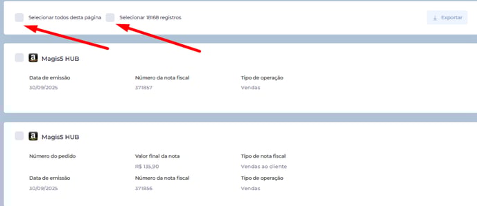 Você pode selecionar individualmente as Notas Fiscais desejadas, utilizar a opção "Selecionar todos desta página", ou ainda "Selecionar todos os registros" para exportar em massa.