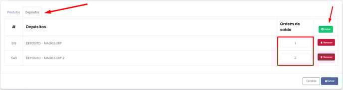 Ao lado da aba "Produtos", está a aba "Depósitos", onde é possível configurar de quais depósitos este terminal de atendimento irá retirar os produtos. Para isso, selecione os depósitos desejados e defina a ordem de saída dos produtos.