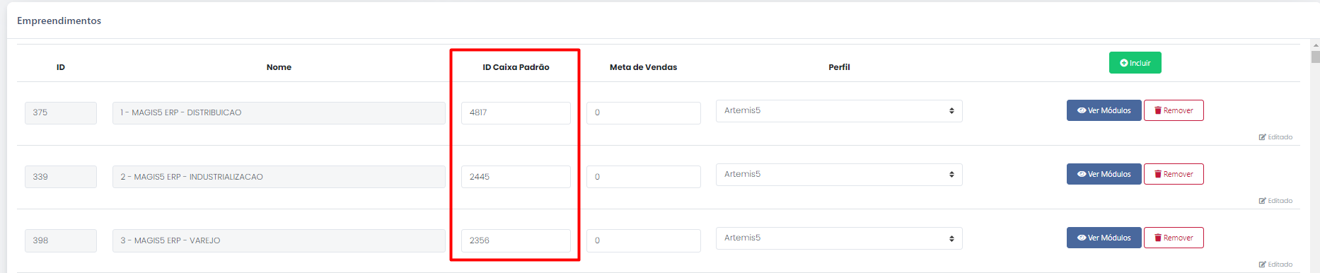 Após inserir o ID no campo “ID Caixa Padrão”, clique em salvar.