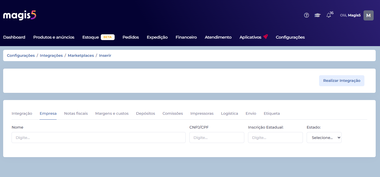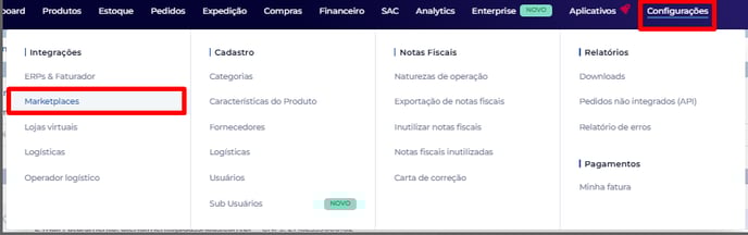 Feito o login no Magis5, vá para "Configurações", depois até "Integrações" e por último clique em "Marketplaces".