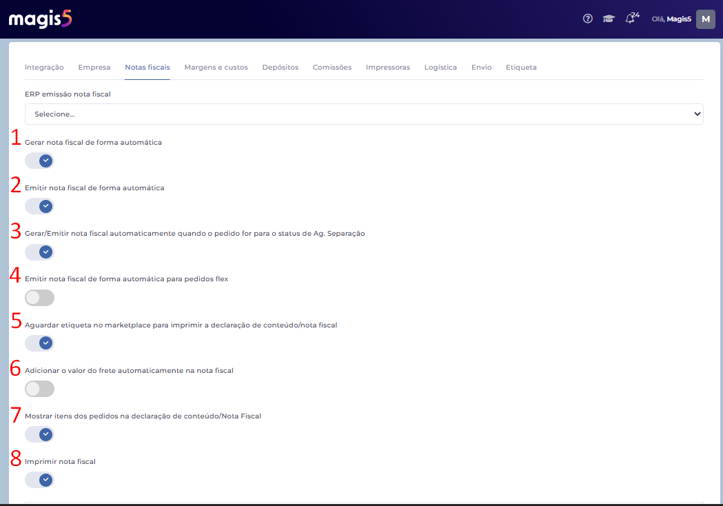 ERP emissão nota fiscal - você deverá selecionar o ERP cadastrado no Magis5 que será responsável para emissão da nota fiscal.