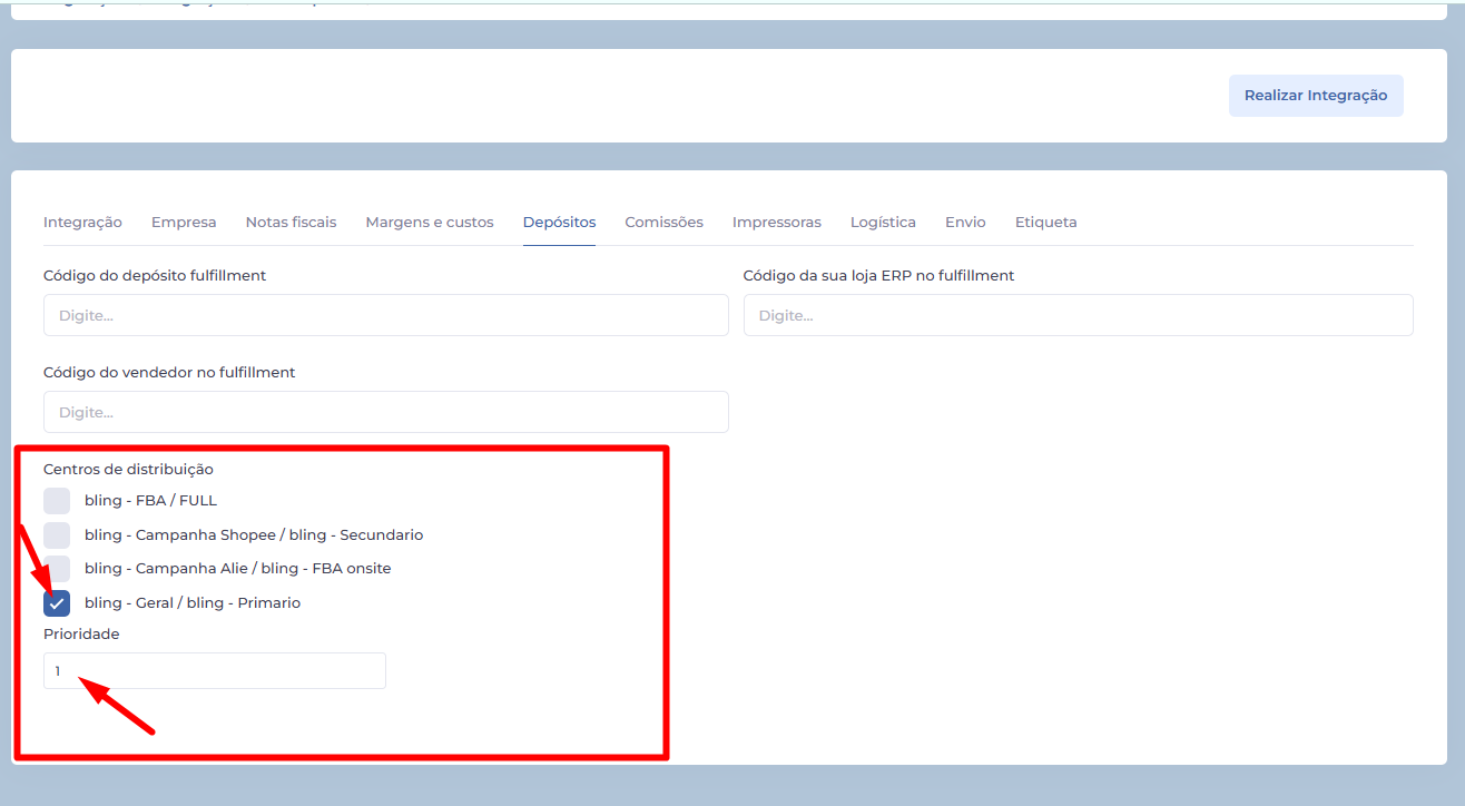 Caso NÃO tenha necessidade, os campos "Código do depósito fulfillment", "Código da sua loja ERP no fulfillment" e "Código do vendedor no fulfillment" devem ficar vazios.
