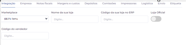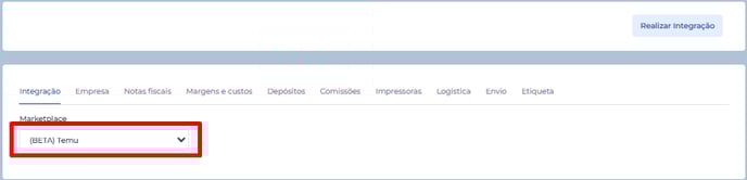 Selecione "Temu" no campo marketplace e clique em "Realizar Integração".