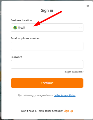 Selecione em "Business location" a opção "Brazil" e em seguida informe seu e-mail e sua senha, feito isso clique em "Continuar"
