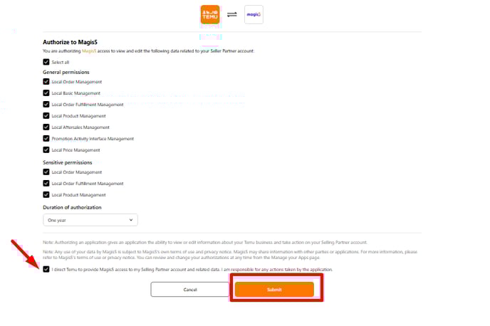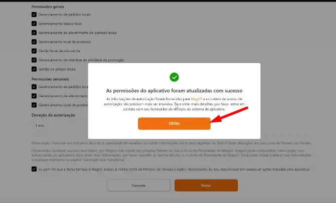 Após clicar em "Continuar" você será redirecionado para confirmar as permissões de integração com o Magis, após selecionar clique em "Submit"