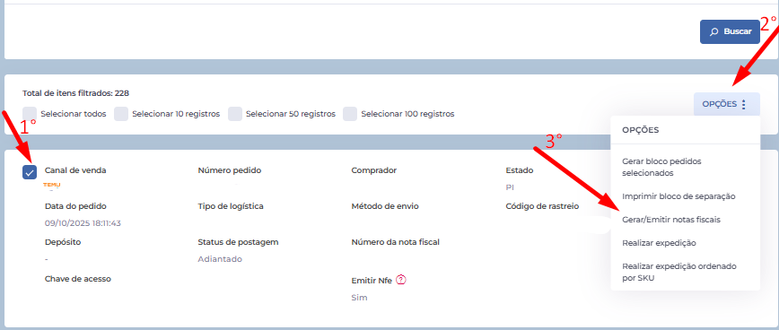 Atenção: caso deseje trabalhar com a emissão automática de notas fiscais desativada, o processo para efetuar o faturamento dos pedidos deverá ser de forma manual, indo até a tela de: Expedição > Picking > Bloco de Separação, selecionando os pedidos e clicando na opção "Gerar/Emitir notas fiscais".