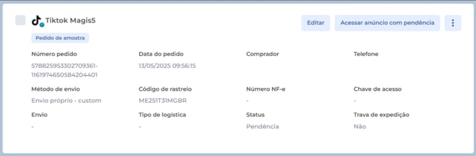 Assim que os pedidos forem baixados no Magis5, o status deles será automaticamente alterado para "Pendência" com a mensagem: "Pedido de amostra. Realize a gestão do pedido diretamente no Seller Center da TikTok".