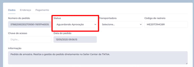 Na tela de edição, localize o campo de status e altere a situação do pedido de "Aguardando Aprovação" para "Enviado" para concluir a atualização.