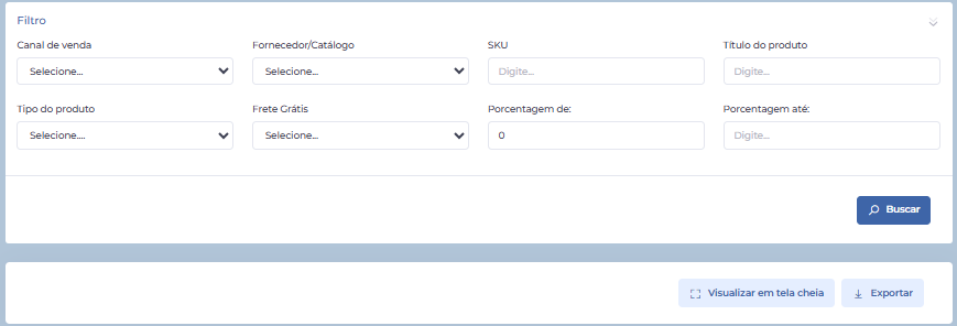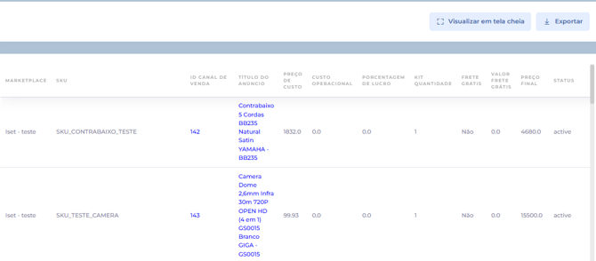 A partir desta tela, você pode utilizar os filtros conforme desejar e visualizar informações importantes, como preço de custo dos produtos, custo operacional, porcentagem de lucro, valor do frete grátis e preço final.