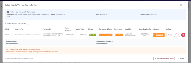 A aprovação de notas fiscais com produtos divergentes é restrita a usuários que possuam permissão específica do setor de Compras.