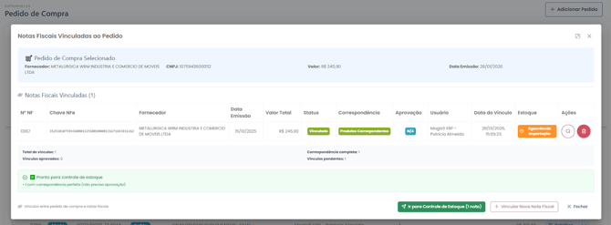 Após concluir todo o processo de vínculo, validação das informações e, quando necessário, aprovação dos pedidos de compra, clique na opção Ir para Controle de Estoque.