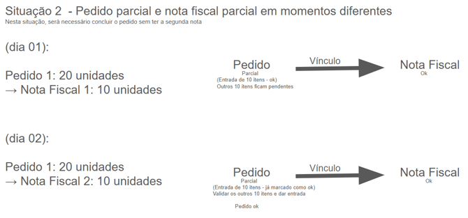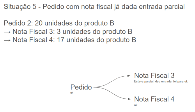 - Caso a nota fiscal não cubra toda a quantidade restante, o pedido permanece parcial.