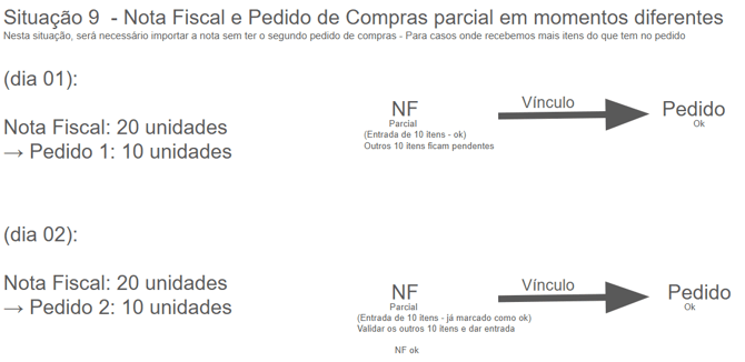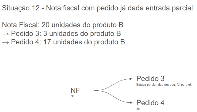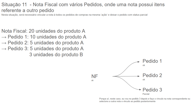 - A Nota Fiscal permanece com status parcial até que toda a sua quantidade seja distribuída entre os pedidos de compra.