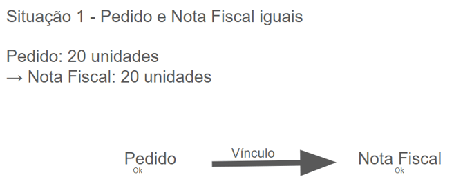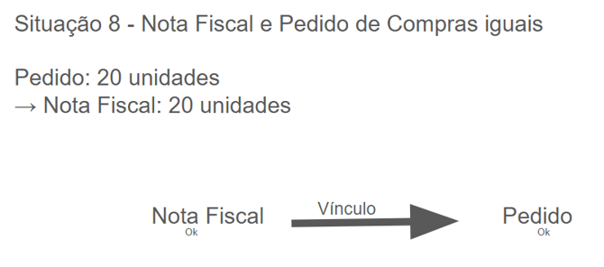 A Nota Fiscal Recebida possui exatamente a mesma quantidade de itens de um Pedido de Compra existente, e o vínculo é realizado a partir da Nota Fiscal.