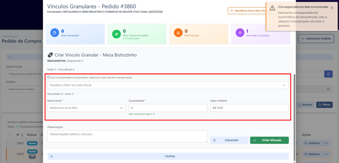 Quando nenhuma informação coincide entre o pedido e a nota fiscal, a correspondência automática não é encontrada. Ainda assim, o item recebido pode ser o correto, exigindo vínculo manual para garantir a continuidade do processo.