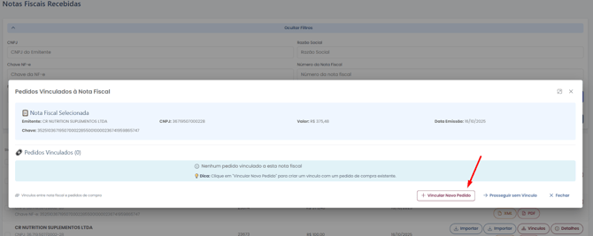 - O sistema permite o vínculo da nota fiscal a todos os pedidos selecionados.
