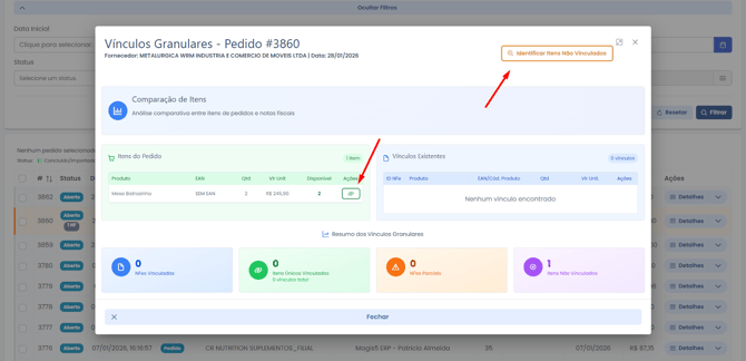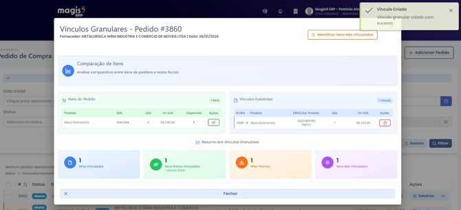 À medida que os vínculos são realizados, o sistema controla automaticamente a quantidade acumulada. Quando o total do pedido é atendido, novas vinculações são bloqueadas, e o botão de vínculo deixa de ficar disponível.