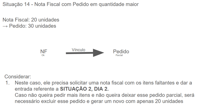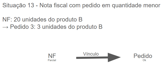 A Nota Fiscal Recebida possui uma quantidade maior de itens do que um Pedido de Compra existente. O vínculo ocorre inicialmente com apenas parte da nota fiscal, ficando o restante pendente para vínculo com outros pedidos em momentos diferentes.