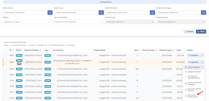 Após selecionar a opção de vínculo, o sistema abrirá uma listagem Pedidos de Compras criados.