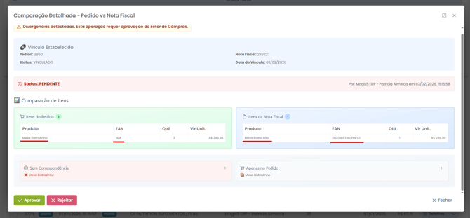 - Produtos divergentes: indica que existe ao menos um item da nota fiscal que não corresponde corretamente aos itens do pedido de compra.