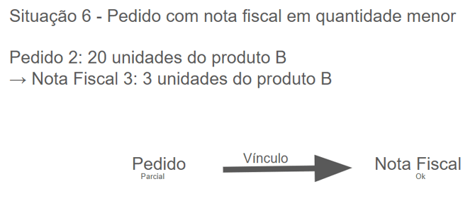 - O usuário vincula a nota fiscal a um pedido com quantidade inferior à quantidade total da nota.