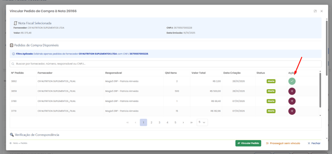 - Não havendo divergências de produto, quantidade ou valor, o vínculo é realizado automaticamente.
