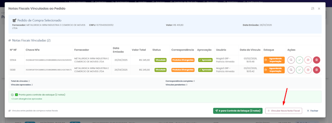Após concluir todo o processo de vínculo, validação das informações e, quando necessário, aprovação das notas fiscais com produtos divergentes, clique na opção Ir para Controle de Estoque.